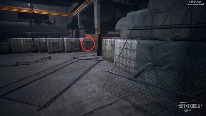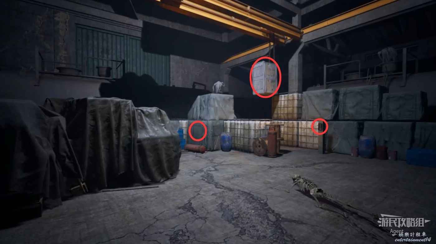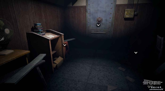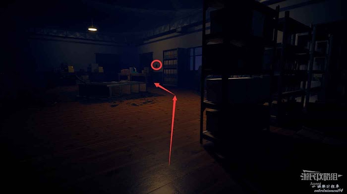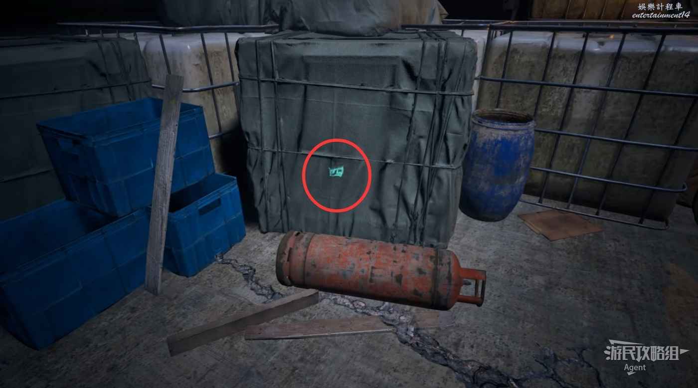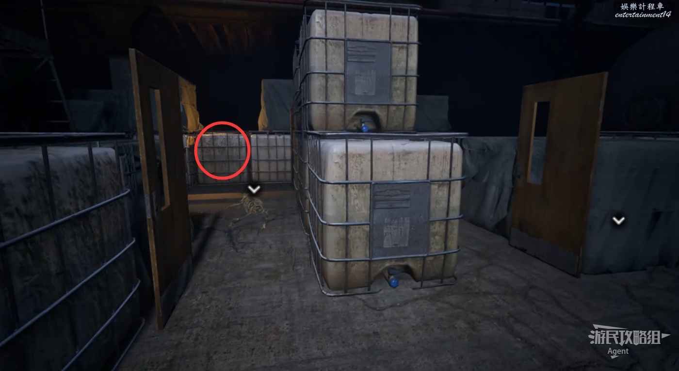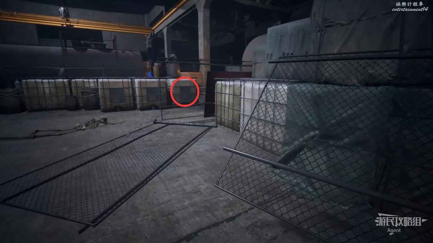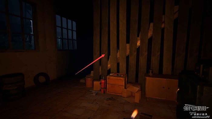 到倉庫門口,關上門,撿起附近的四塊木板,用一塊木板擋住門,然後將圓形閥門放到鐵門上。