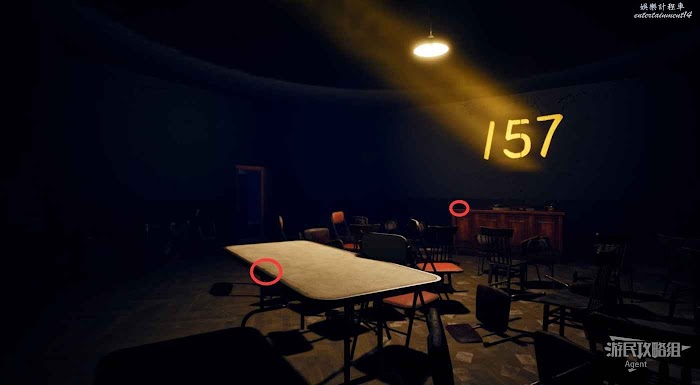 乘電梯下來,來到投影室。桌上拿到膠片,把膠片放到白桌子上投影,看到數字157。和之前映寫室的數位組合便是第七實驗室主控室的密碼:491157。(現在映寫室就在附近,穿過投影室繼續往前走就能過去,如果忘了數位還可以再去查看)