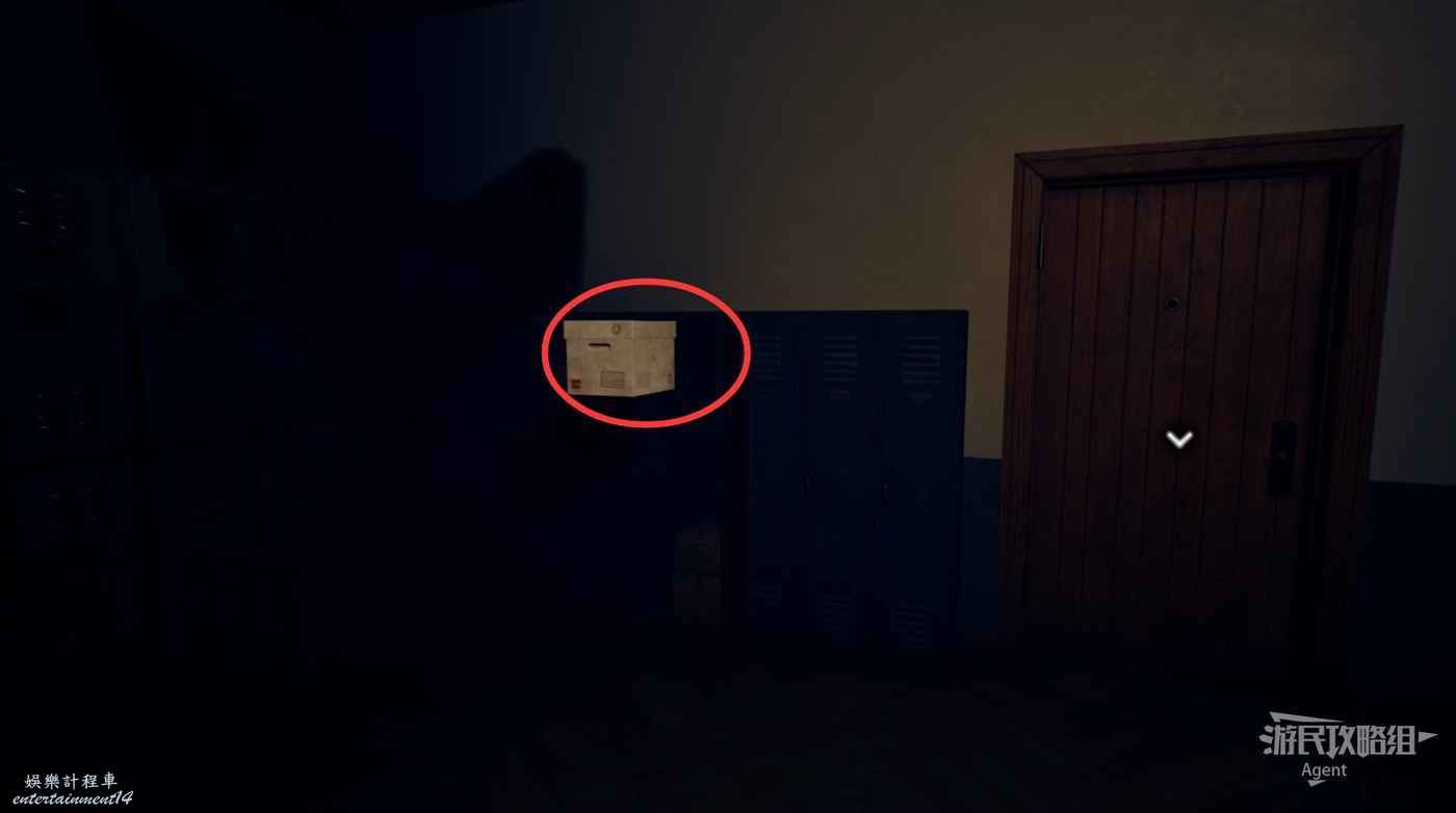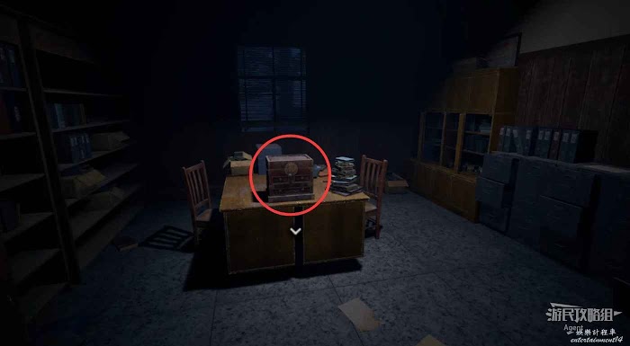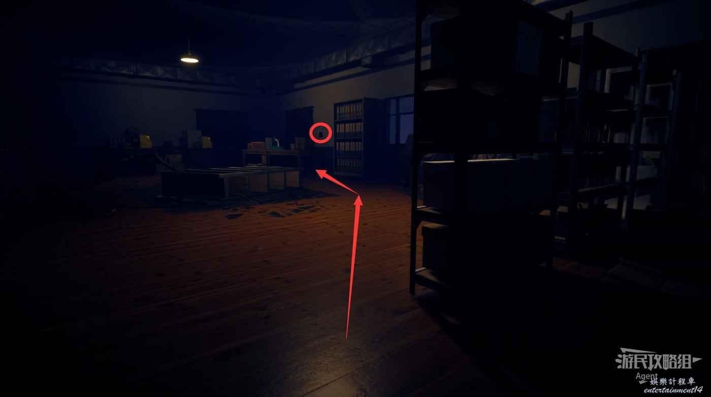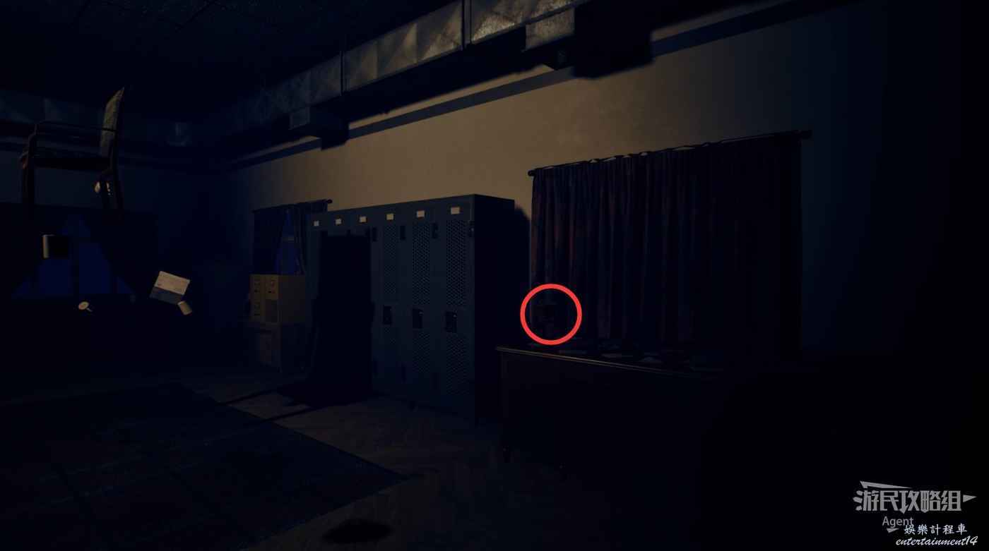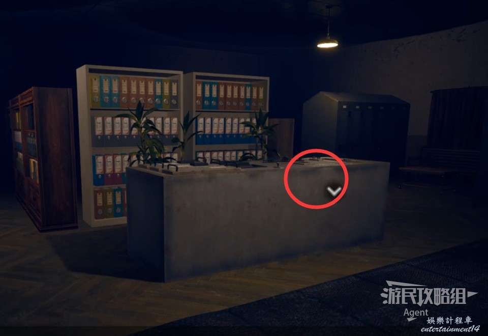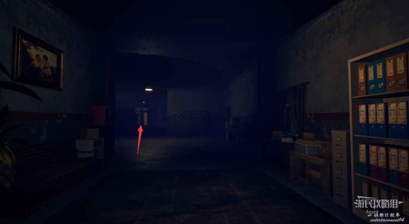 資料室內有怪物,蹲下慢慢走,注意別踩到地上的玻璃殘渣,到裡面小屋裡拿到秘聞。