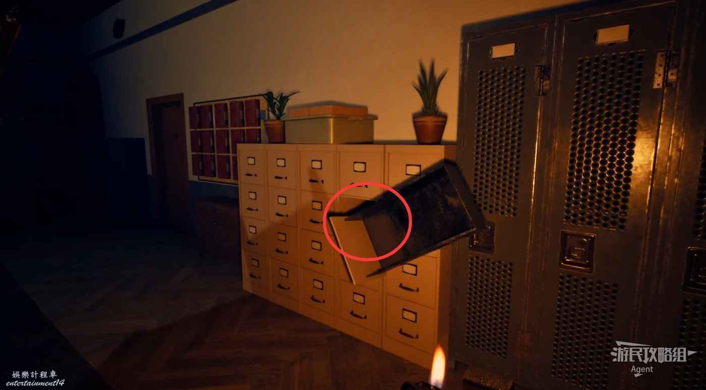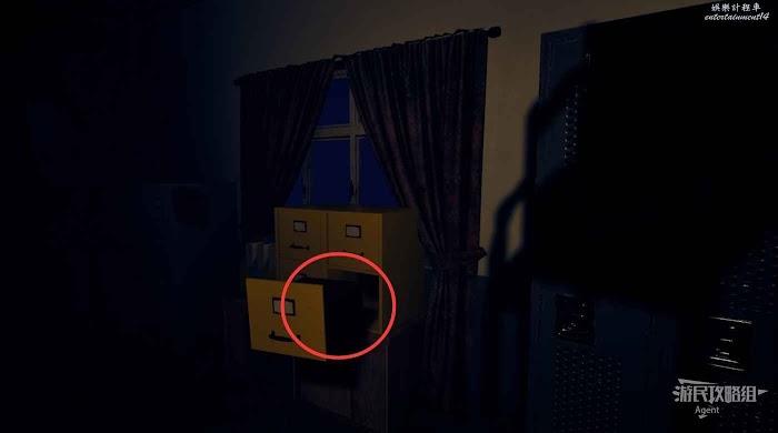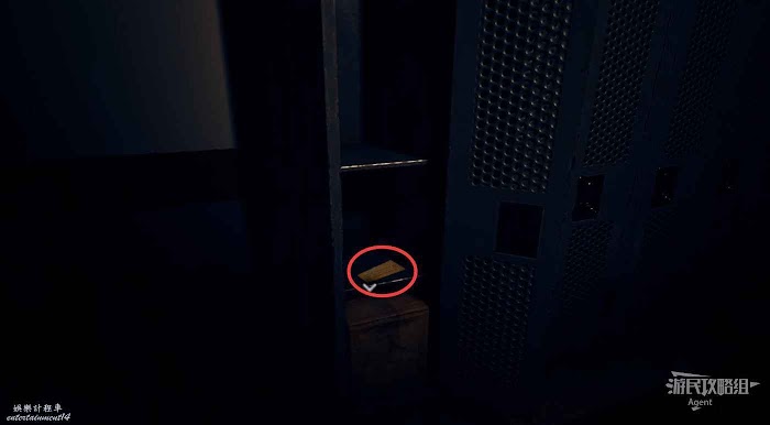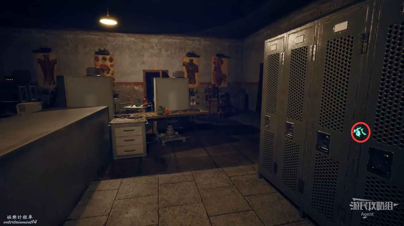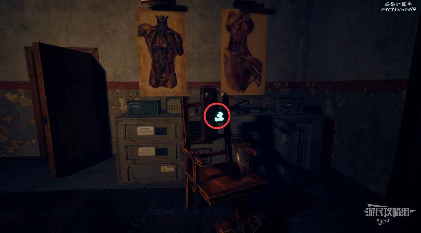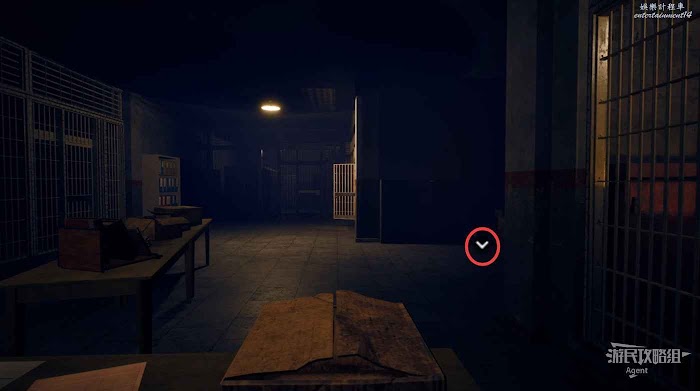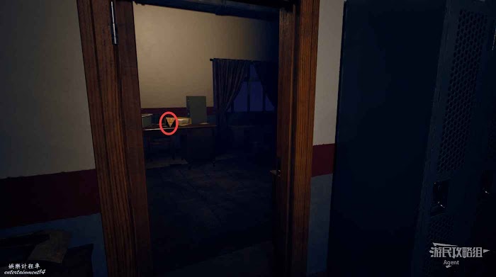 資料室內有怪物,蹲下慢慢走,注意別踩到地上的玻璃殘渣,到裡面小屋裡拿到秘聞。
