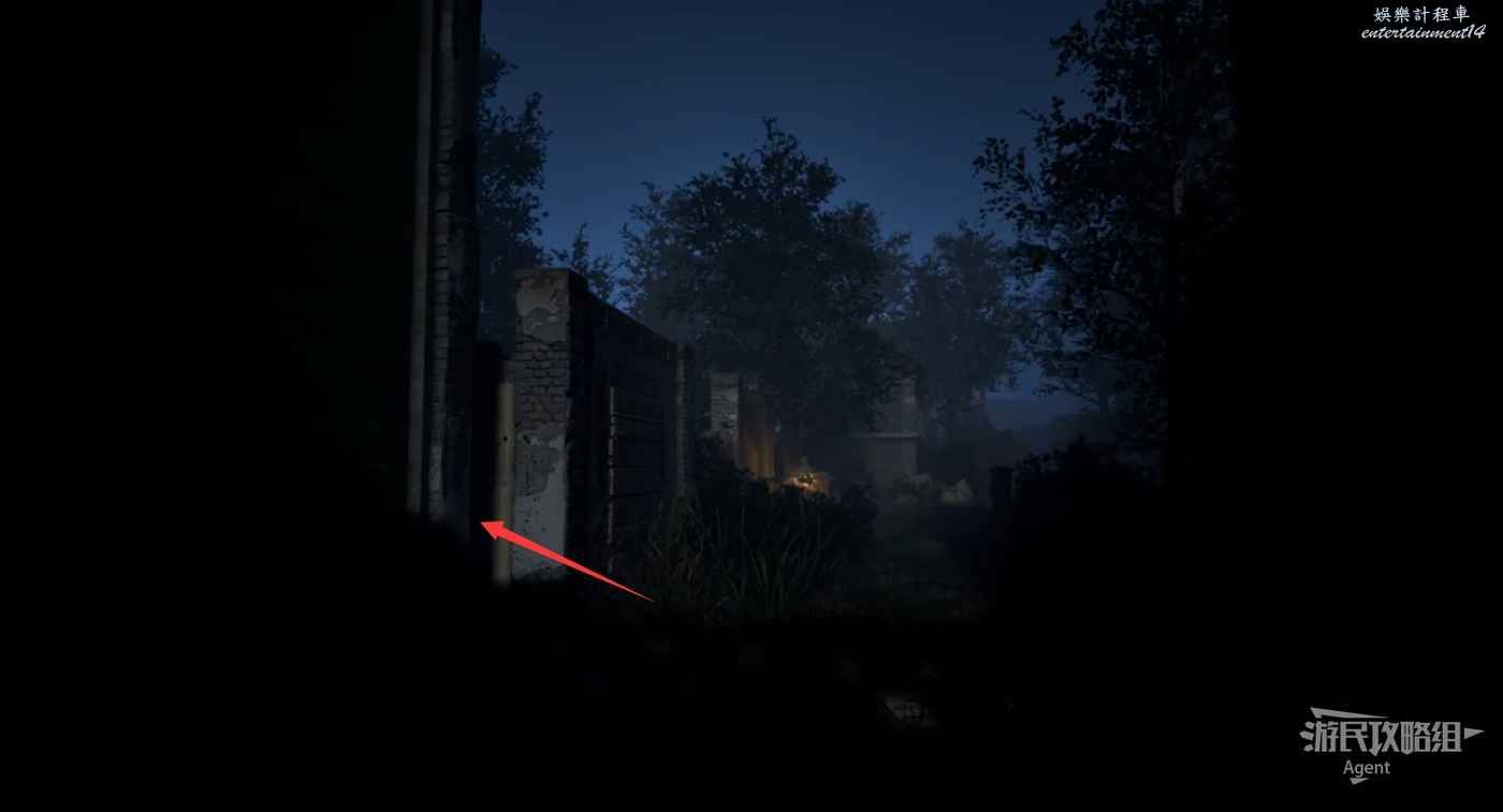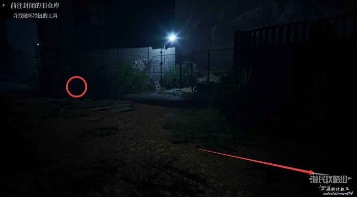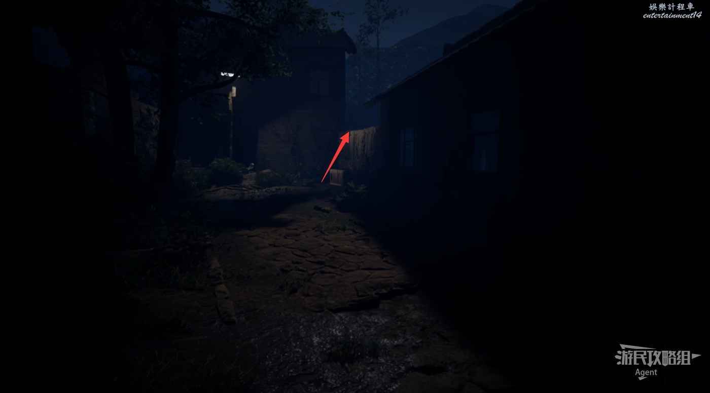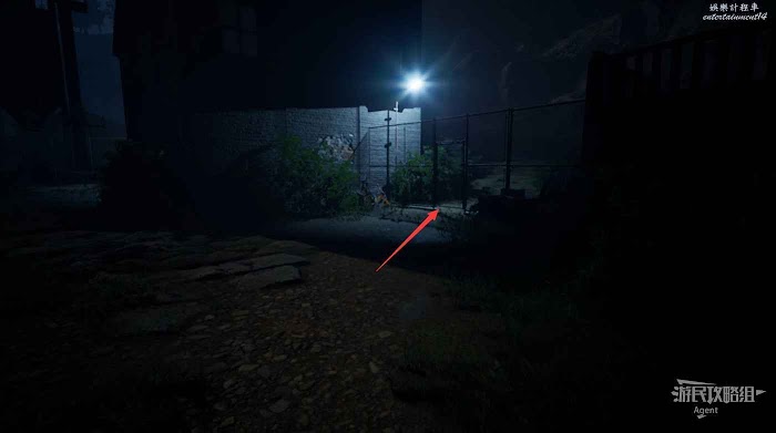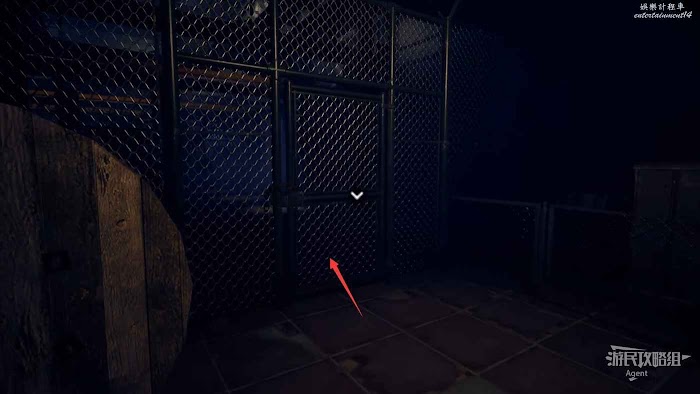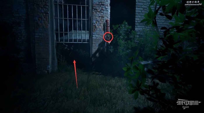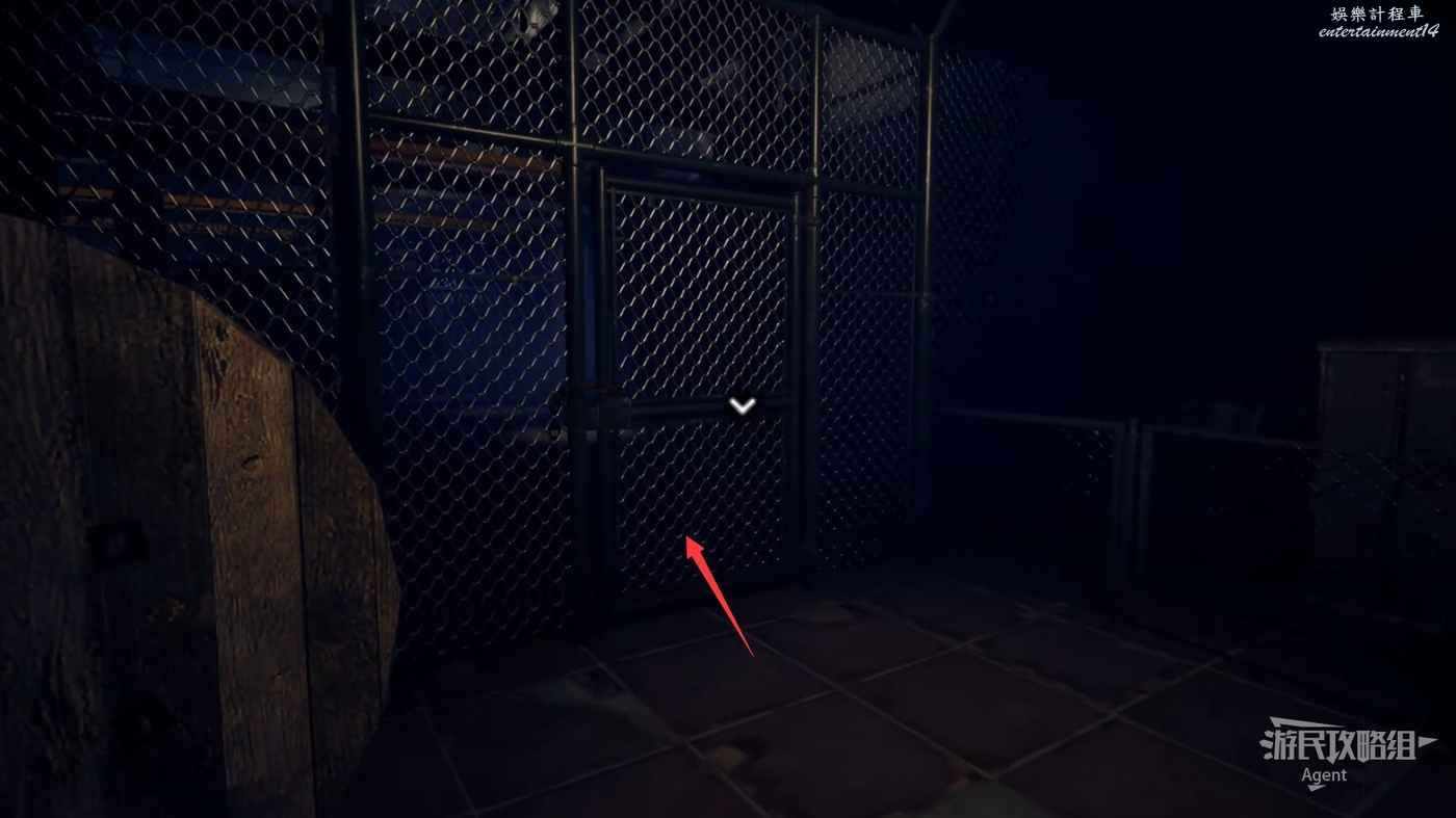 鑽過洞後,前面的鐵門打不開,右拐翻過牆去找鐵門鑰匙。