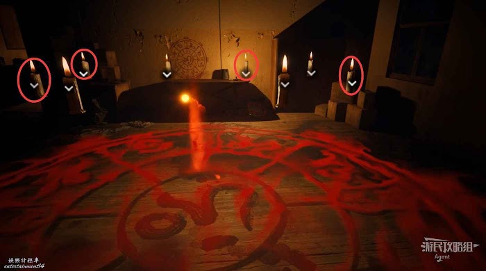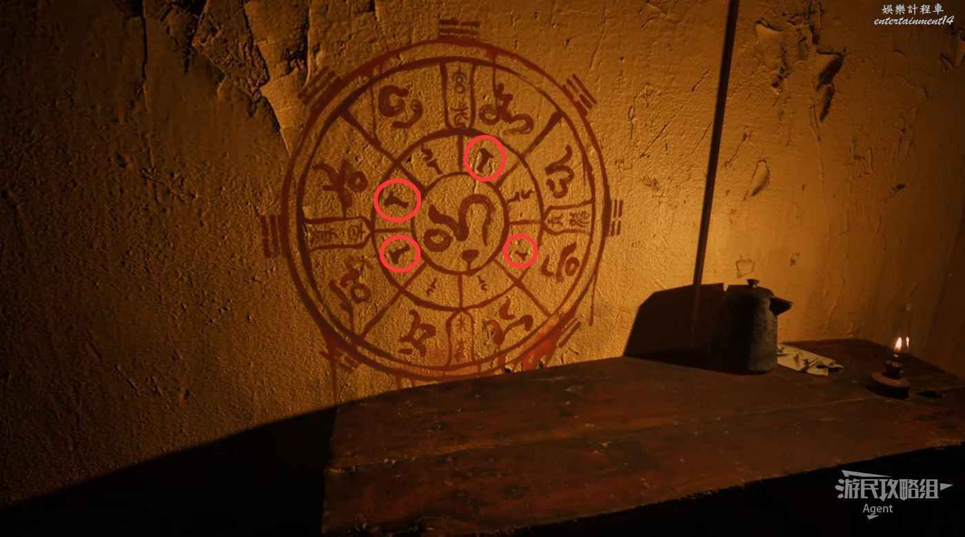 牆上的就是謎題提示,注意內環上的符號,代表熄滅的蠟燭(下圖已圈出)或點燃的蠟燭(蠟燭和火苗)。