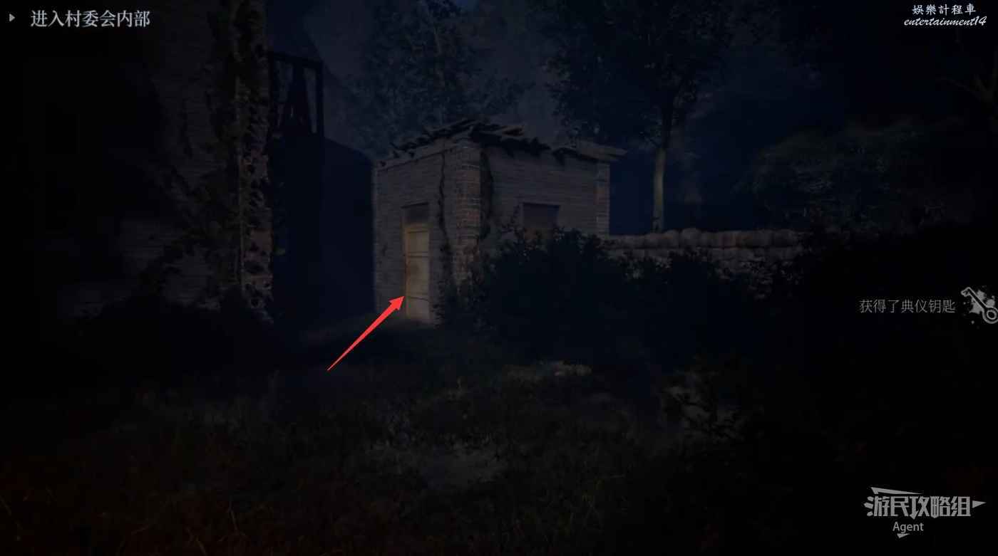 把箱子推到門口,然後踩著箱子爬過門上的洞進入村委會。