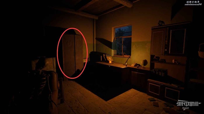翻過牆後往前走遇到大鳥怪,立馬回頭,進屋躲進櫃子裡。