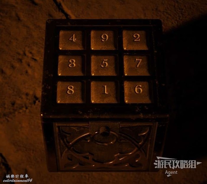 按下圖分配數字,使橫豎斜的任意三個數字相加都等於15,打開盒子得到頭骨碗。
