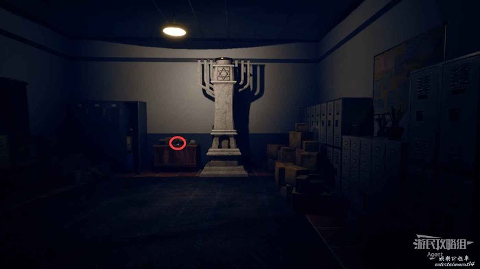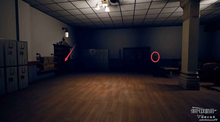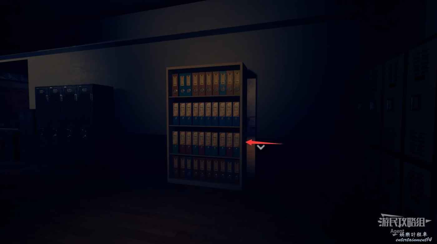 走廊長椅上拿到破譯室鑰匙,然後推開書架。