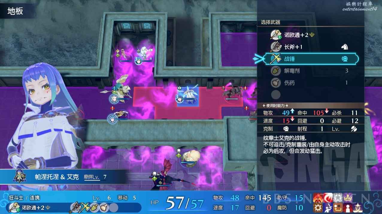 第二回合上路打手繼續向左清掉1到2個輕甲怪,中路剩下的兩人自我傳送到上側安全區。艾克使用戰錘開大吸引右側全員仇恨,拿戰錘時屬性如下,速度最好不要低於15,不然會被弓箭手19速追擊。