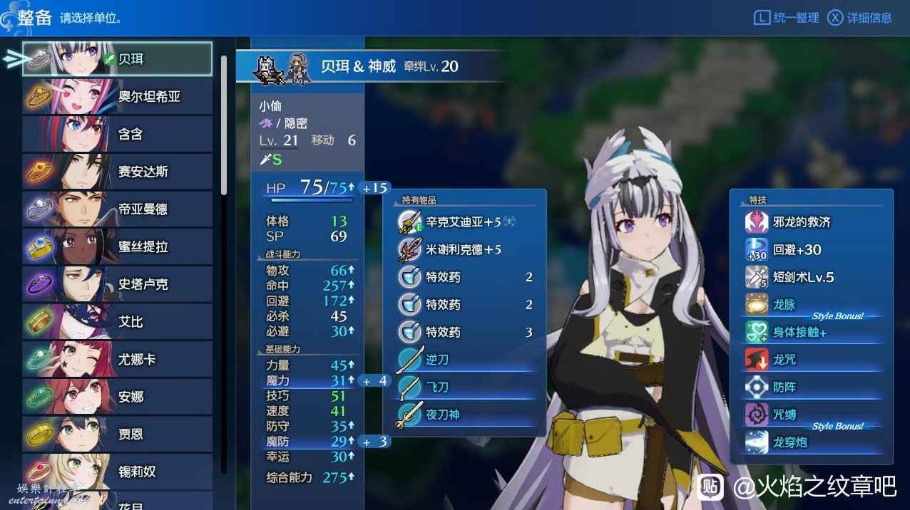 2、貝爾 補正是+3魔力、+3魔防,(全遊戲唯一的 +6、-3屬性的角色、同職前提下綜合資料最高)用魔法刀輸出可以,+3魔防 彌補盜賊魔防低。