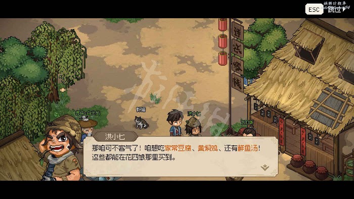 在客棧門口與洪小七對話,他告訴主角想吃[家常豆腐]、[黃燜雞]和[鮮魚湯]。