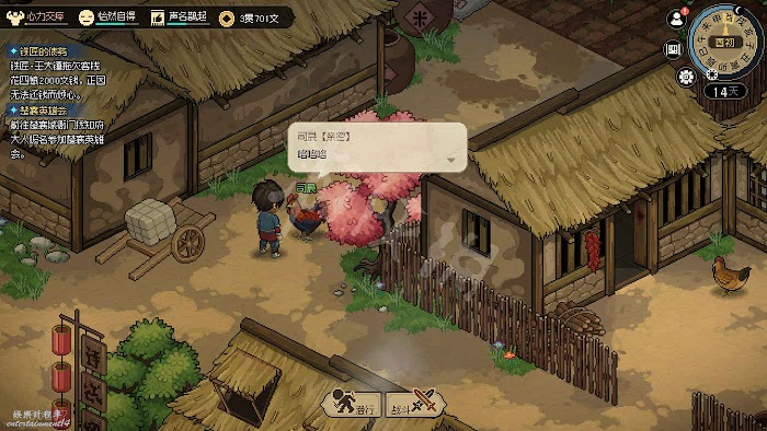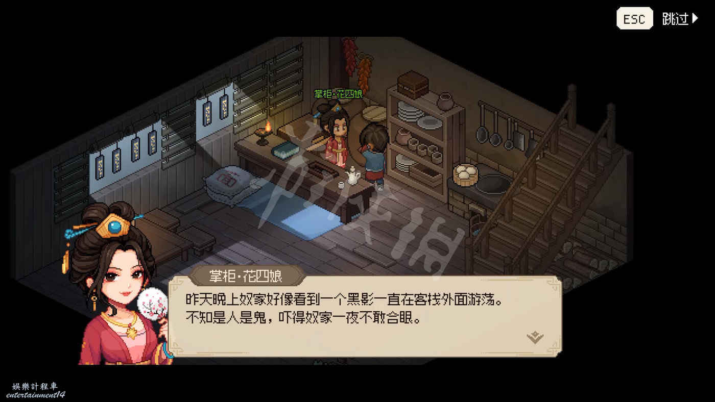 與花四娘對話,她會告訴主角在客棧外最近會有黑影出現,主角決定幫四娘調查清楚。