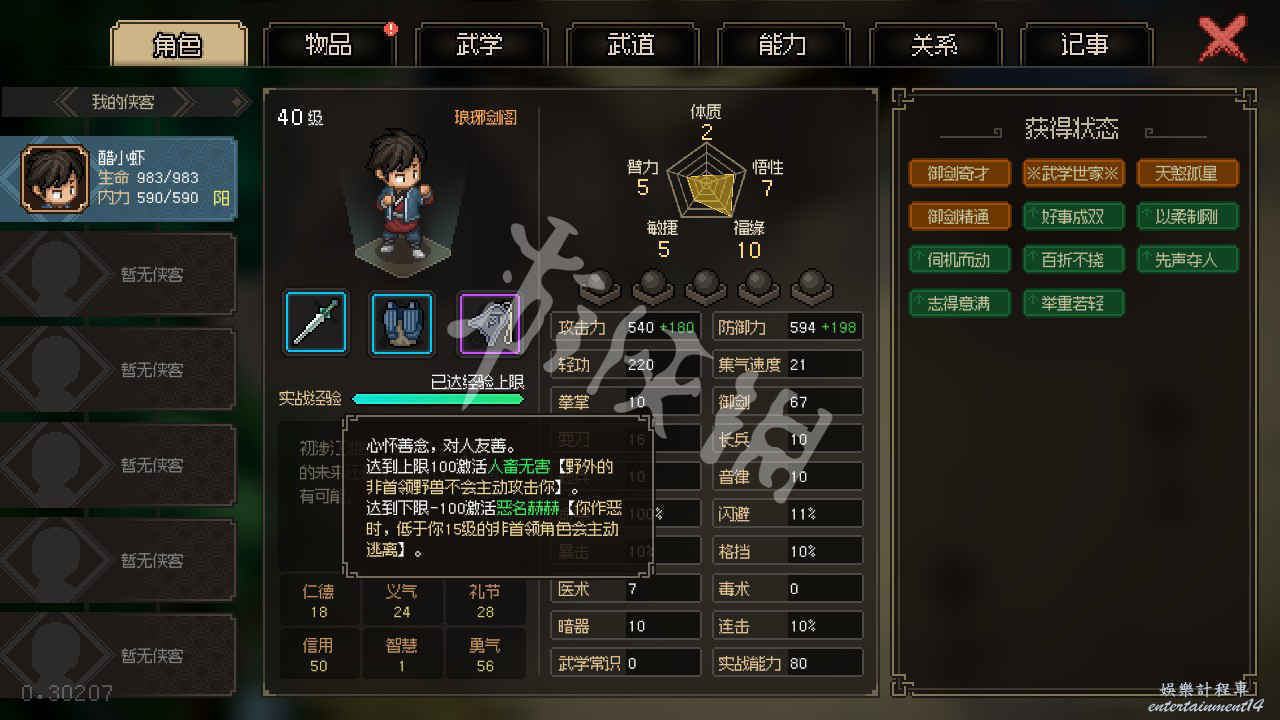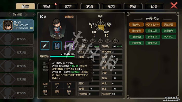 仁德:為非作歹,做一些壞事會降低仁德;與角色交好,提升關係,會增加仁德。