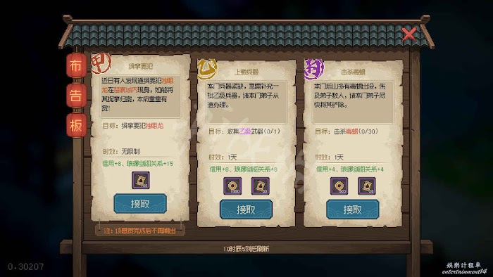 玩家可以在城市和門派的委託板那兒接受對應地區的懸賞任務。
