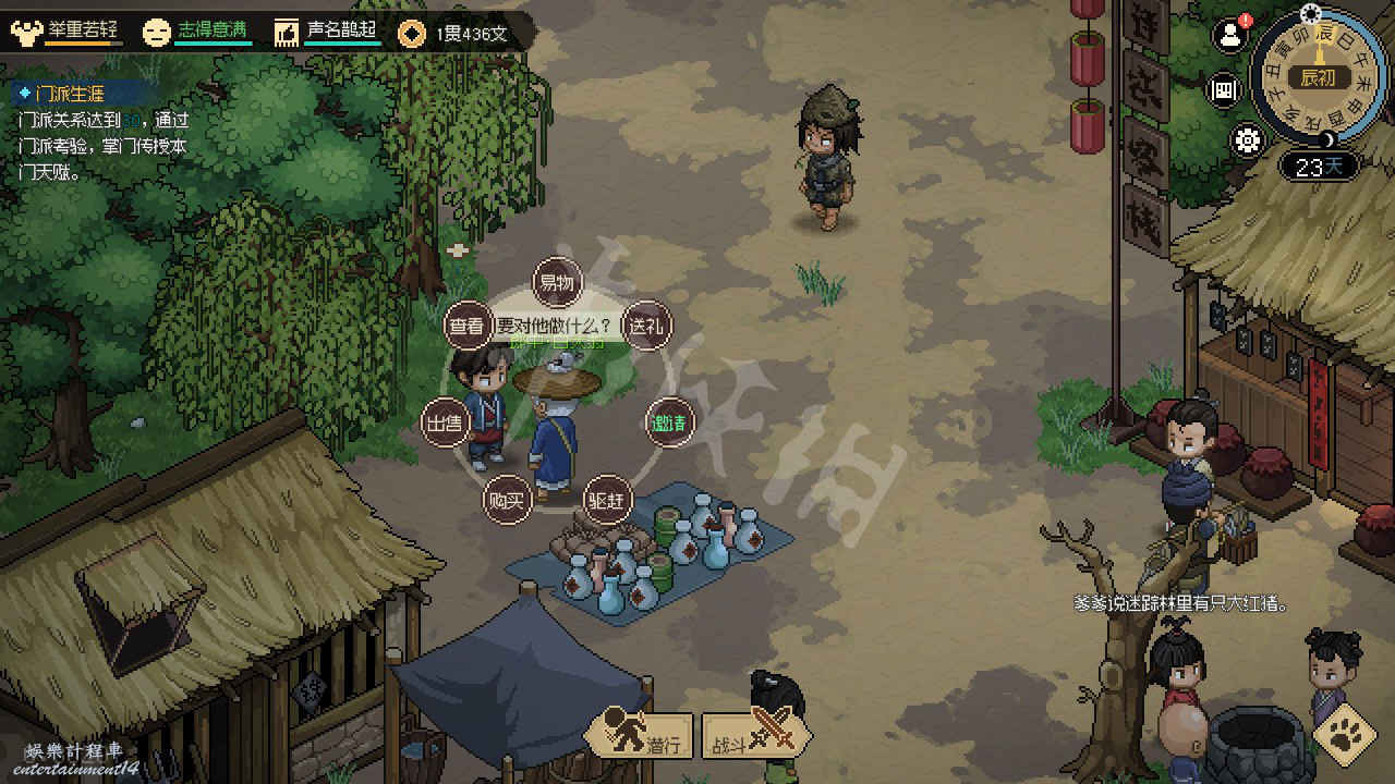 暫不明確,可能需要提升花四娘的好感度,或是提升主角等級等,滿足條件後在村口自動觸發劇情。
