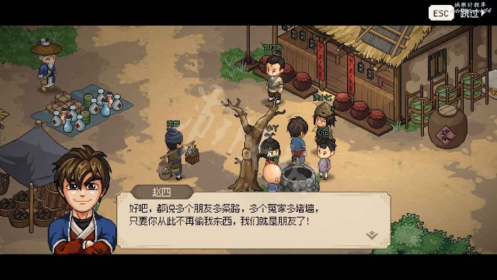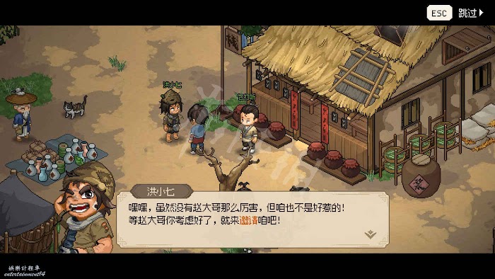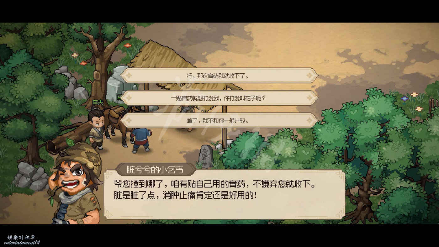 來到客棧門口與小乞丐洪小七對峙,他會裝傻充楞,選擇第一項進入戰鬥。