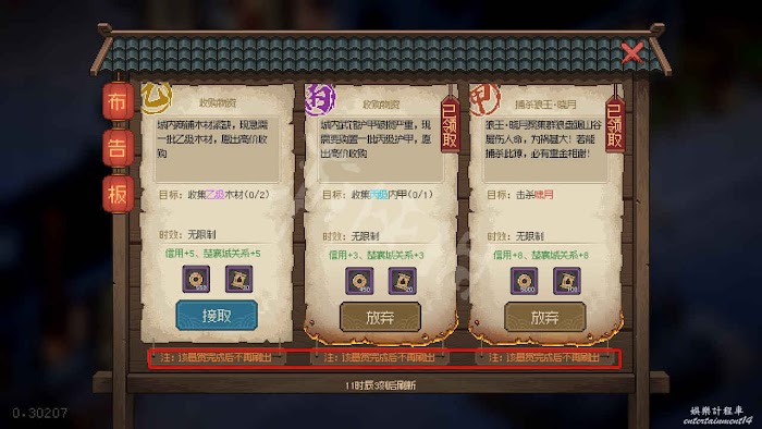 懸賞任務根據難度有甲、乙、丙的級別區分。一些常規的收集、殺敵懸賞都會有時限要求,不能按時完成的話將降低信用以及對應地區的關係。