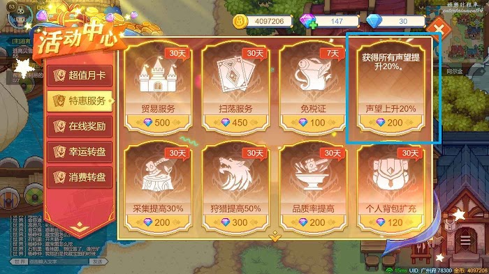 同時我們還可以在特惠服務中購買聲望上升服務,以在完成活動時獲得額外經驗值。