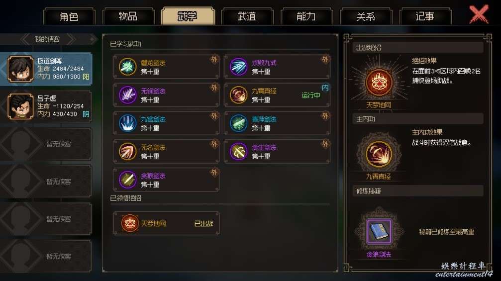 刷出獨孤劍一,送禮好感度拉滿,入隊學獨孤劍一的紫色劍法,要敏捷 9。