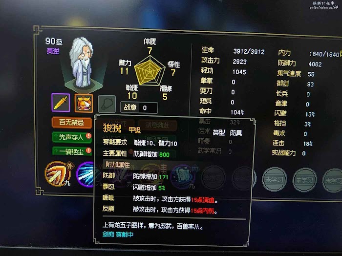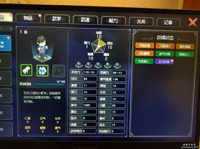 然後悟性,上面說過大約是每點悟性提升1等級數的攻擊力以及1.15等級數的防禦力,並且減少50內力上限,也就是說10悟性和1悟性開局相比,最終打樁切磋到100級時,攻擊力相差900,防禦相差1035,等於高了一套甲級裝備了,只不過內力和連擊低了一點。