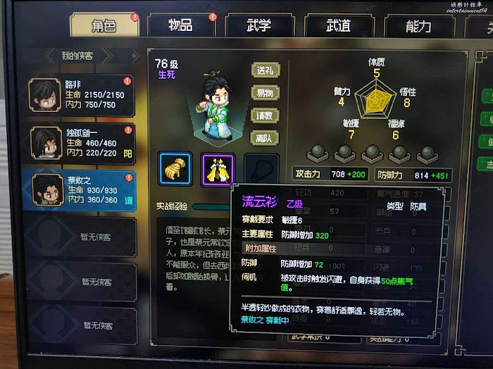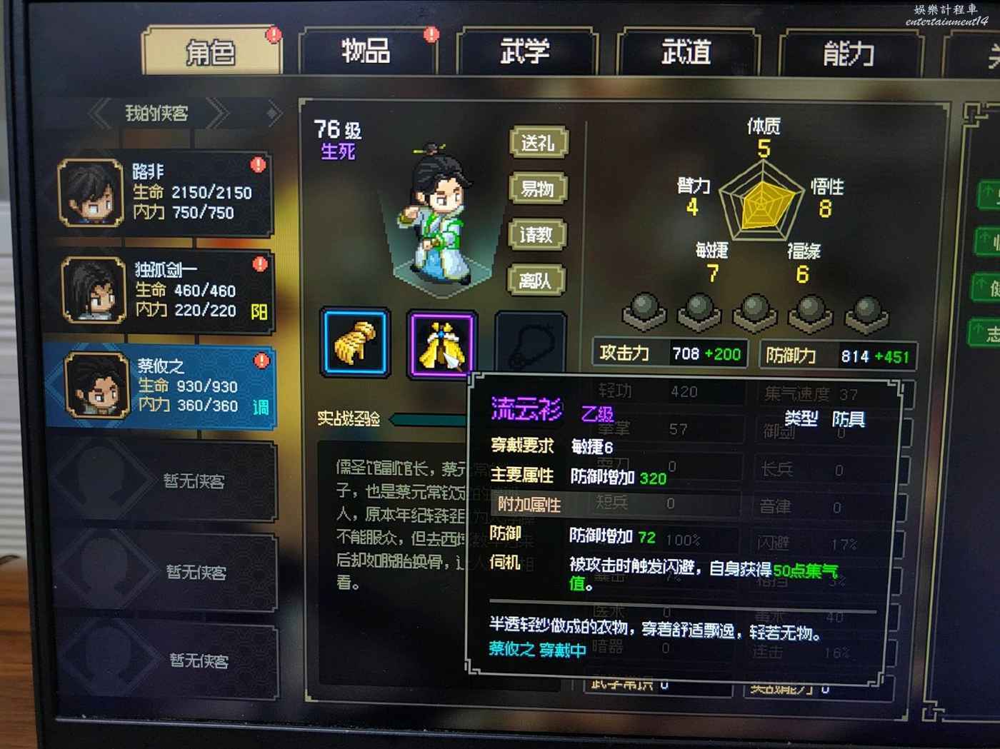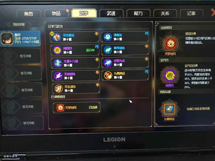 另外,我沒有學落千雪一開始給的三本內功,我憋到回村學了藥師的內功,主要還是藥師內功每回合回藍,可以撐過前期一些尷尬時刻,初始內功不學也罷,後期反正用純陽功。