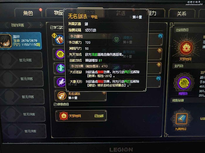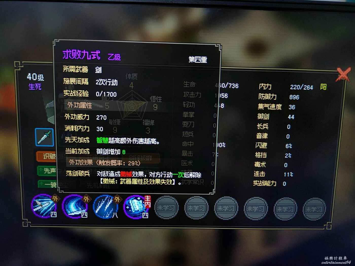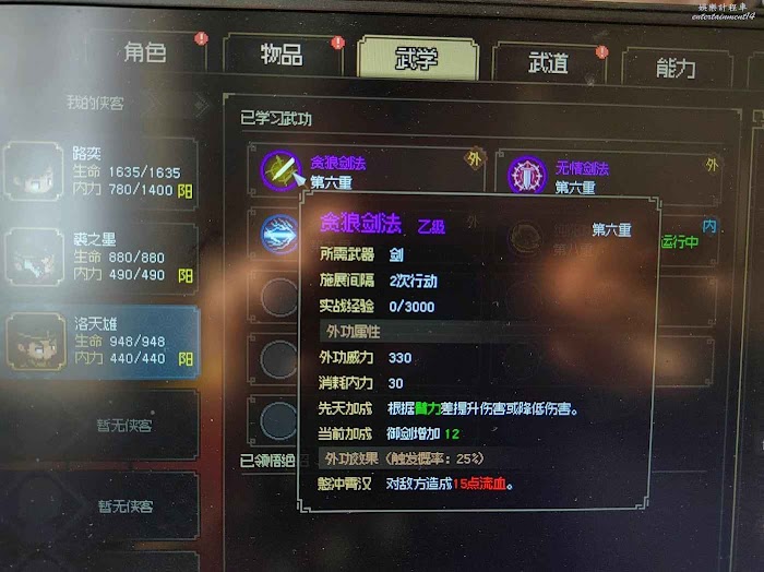 然後是天狼劍法,流血,力量加成,沒太大用處,劍癡那邊11點力量呢,等於沒加成……