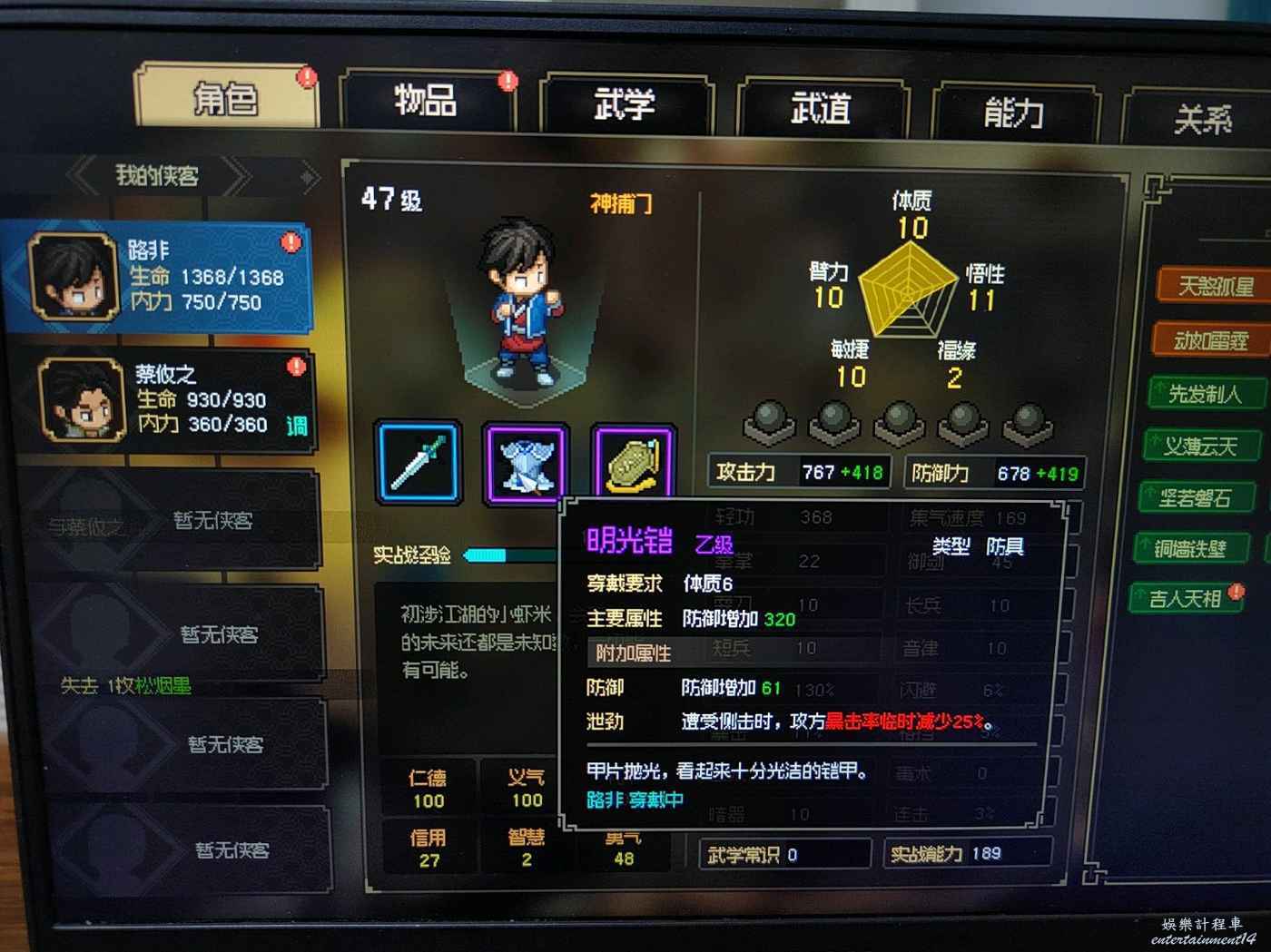 然後力量福緣放在一起說,這倆半斤八兩,力量高一點也就暴擊高一點罷了,10力量的特效秒殺也沒啥用,本來等級比對手高時,我方也基本夠秒殺了。福緣是影響暴擊連擊閃避,收益有,但是不多,10福緣特效增加的一點戰利品,也有點小家子氣,他要是必定給雙倍戰利品還有用些。所以這兩個屬性,我建議是開局都儘量低一點好,把屬性分配給其他的,尤其是力量,因為力量是遊戲內最容易鍛煉的屬性,採礦砍樹釣魚抓蟲幹啥都漲,每天把楚襄附近的採集點都拉滿,我試過差不多遊戲第15天左右就從初始4力量漲到11點(超出上限的一點可能是開局十裡坡漲的,不計入鍛煉上限)。所以力量屬性,多幹活就等於白送,開局越低越好。而如果走劍法路線的話,後期又不能低,劍閣歐衍身上請教的無鋒劍法觸發特效後是第一輸出外功,遠超甲級劍法,但是請教要求9力量,平時還是要在劍閣後山多挖挖礦就是了。