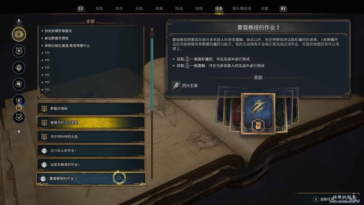 在支線任務方面,首先本作的支線任務極其少有單獨的跑腿和殺怪任務,所有的支線任務都有相對獨立的流程設計、有配備全語音配備、部分還有專門的場景和關卡設計(比如各個夥伴關係任務),然後更重要的是,很多支線任務提供的獎勵不菲——包括了裝備、金錢、經驗、魔法變幻的配方等等,部分任務甚至會提供法術學習的機會(當然,這些任務也往往是作為主線前置的一部分了)。