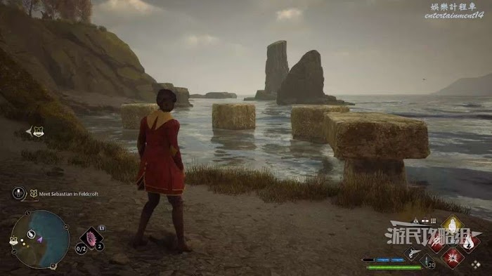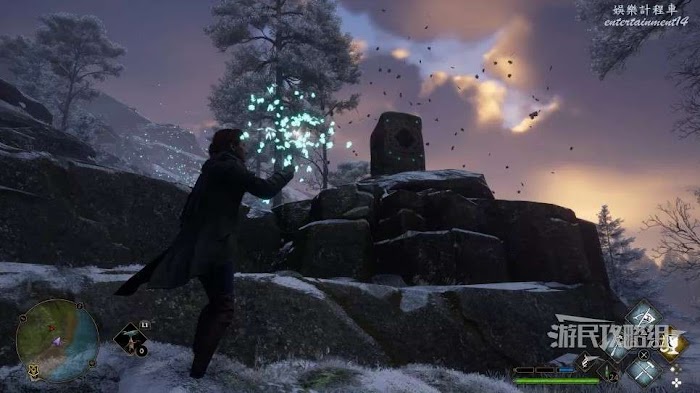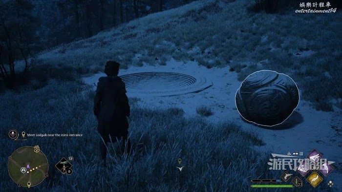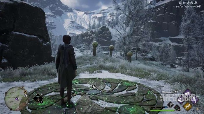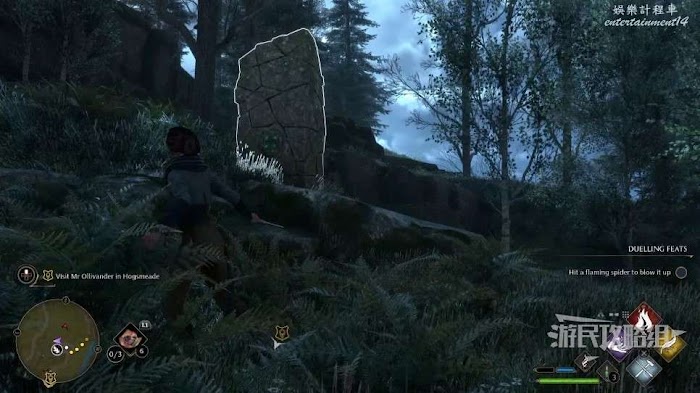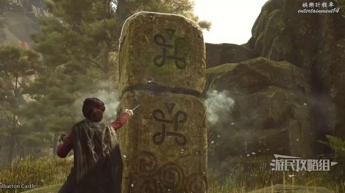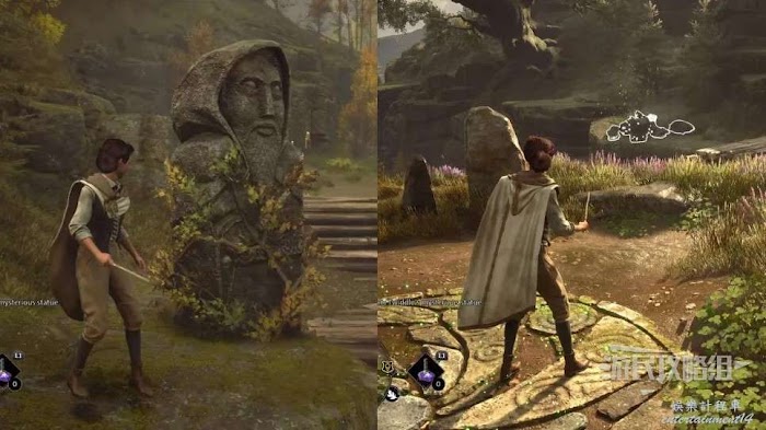 地面上有一個很大的圓形凹槽,附近還有一個大石球,用【統統飛走】咒語把這個石球推進凹槽即可。