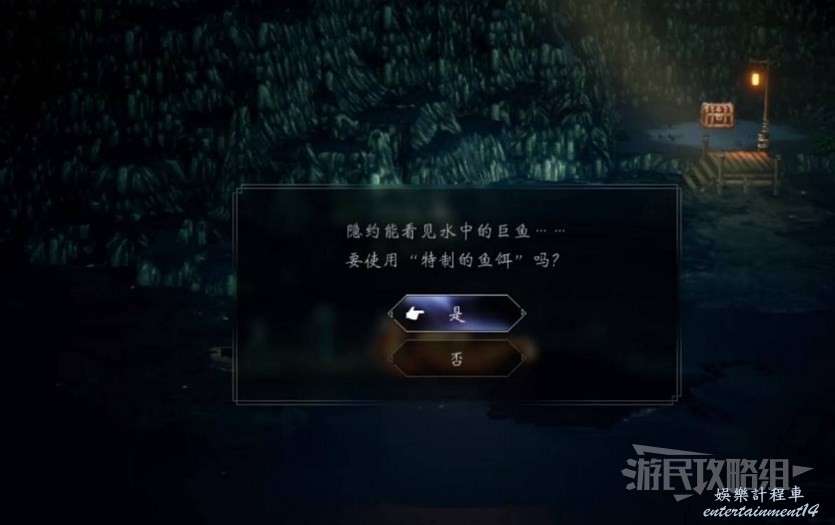爬下梯子後,乘船往右邊走,水面會出現巨大的魚影,在此處使用特製的魚餌。擊敗怪物後可獲得「德魯斯塔魚×1」。