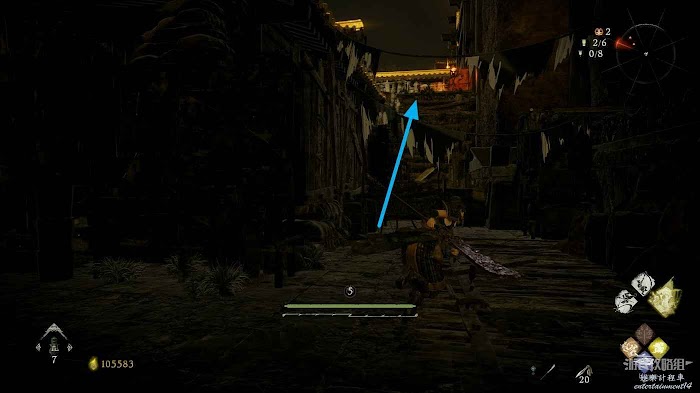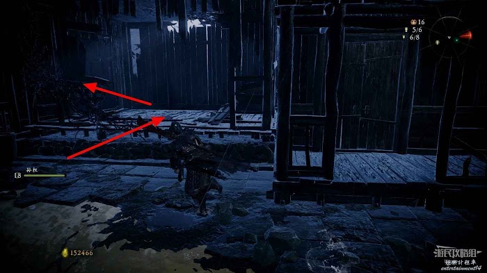 隨後原路返回向左側前進,在塔樓旁的地面上可以撿到3根箭矢。