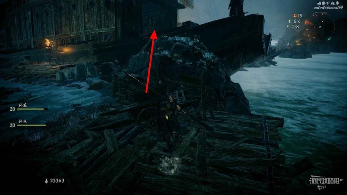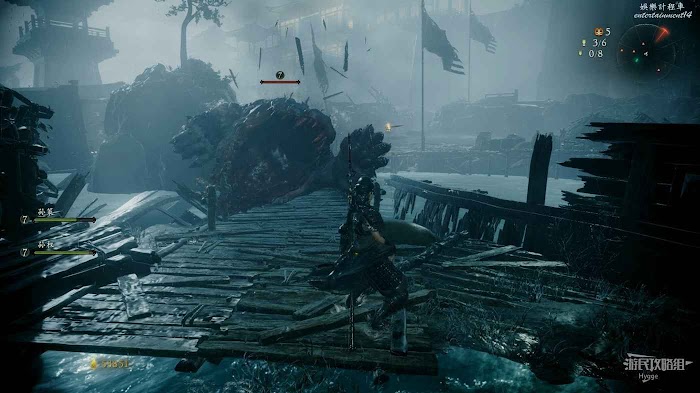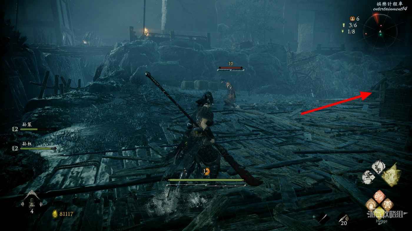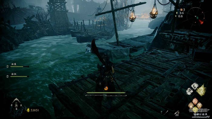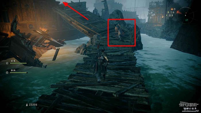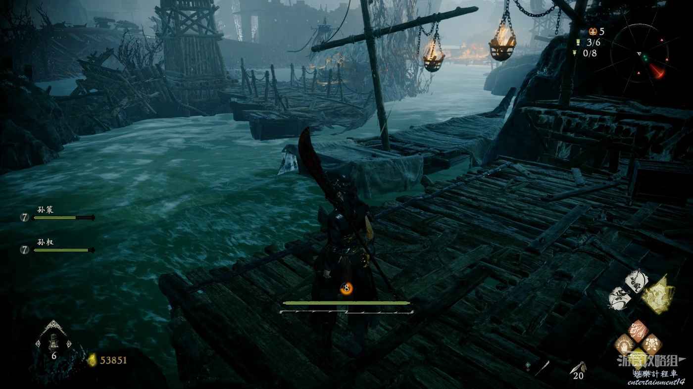 沿著木橋前進,撿起1個真氣小塊後將系船柱推到,消滅前方的行屍和遠處的巫士。