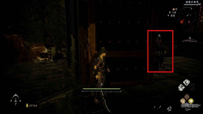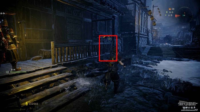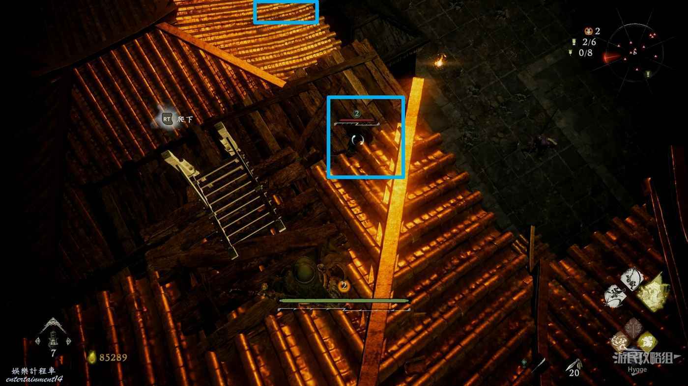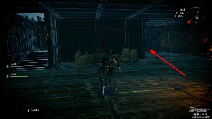 前方樓梯處還有1名士兵巡邏,將其帶到屋簷下消滅可以避免戰鬥時遭到上方的攻擊。