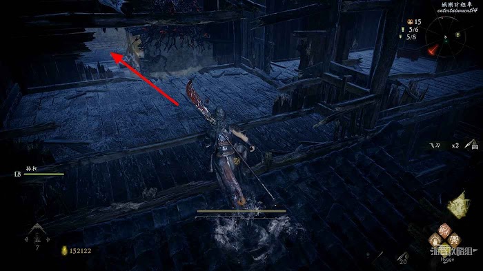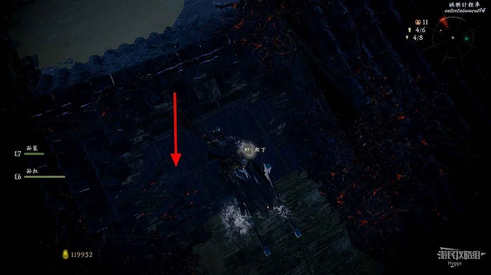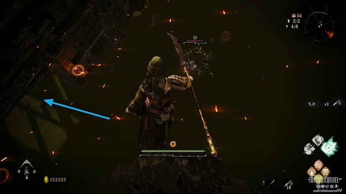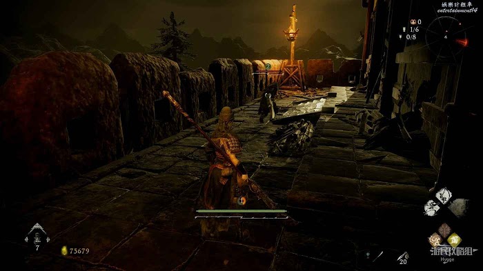 隨後返回走廊,通過旌旗旁的大洞跳至下層平臺後可以撿到+3的戰姬披膊,但需要小心平臺後側的行屍。