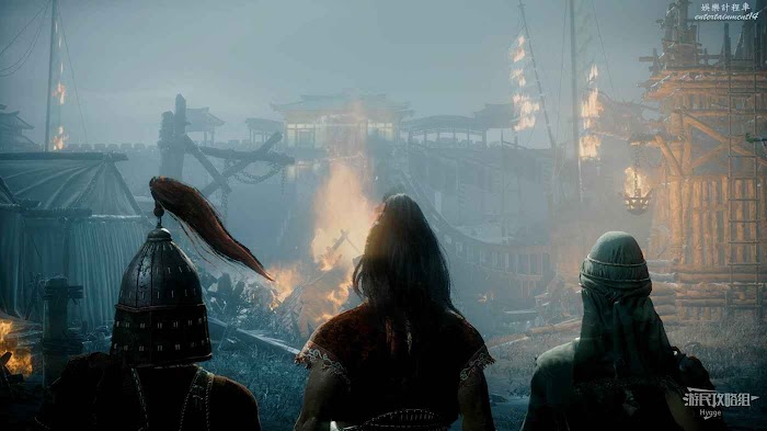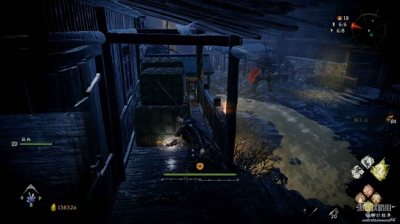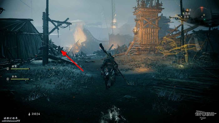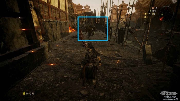 隨後沿著城牆繼續前進,在前方的木架上可以撿到1個猛火壺,但需要小心前方屋頂上的兩個弓箭手的射擊,撿完東西後立刻向前跑快速通過此段城牆。