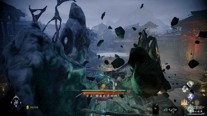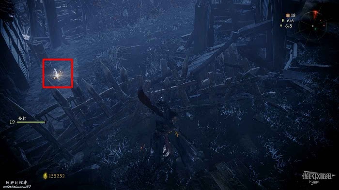 通過木架跳過圍牆,消滅前方的2只行屍和1名巫士後可以在轉交處撿到1個真氣小塊。