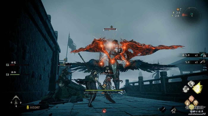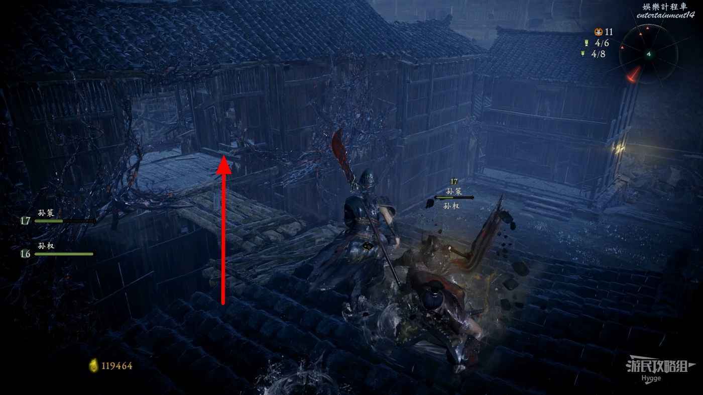 在前方的斷橋上可以撿到2個調兵虎符,隨後通過左側的木架向上。