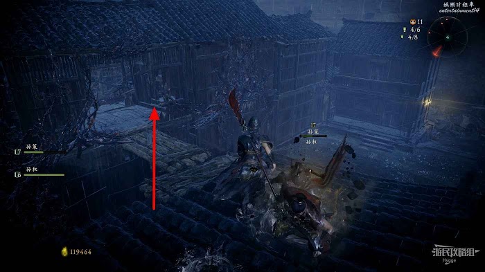 回到城牆上跳至另一側小樓的屋頂上,在屋頂上可以撿到1個真氣小塊。