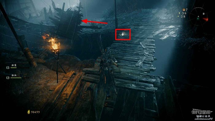 消滅木橋上的敵人後可以在木橋前方盡頭處撿到3根弩箭。