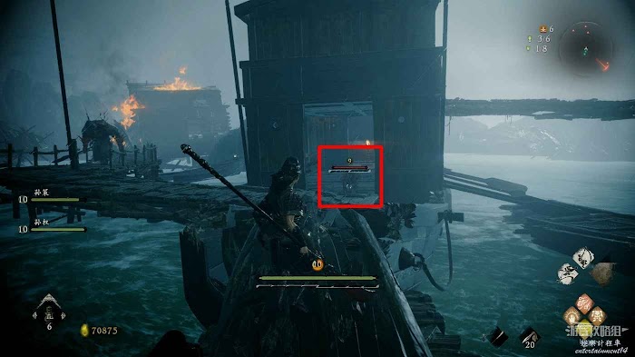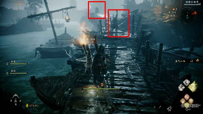 穿過泥潭消滅一隻海妖後在碼頭處將系船柱推倒,在旁邊還可以撿到1個真氣小塊。