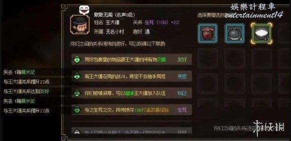 大俠立志傳 (Hero’s Adventure) 王大錘入隊方法 14 3 月 2023-03-14 廣告 來源:互聯網 位置:無名小村 禮物喜好:酒 送禮物推薦:糯米漿 入隊條件 好感度關係達到知己,可以邀請入隊。 獎勵: 完成俠客支線任務“幫鐵匠還花四娘酒錢”2000文,可獲得配飾磨刀石。