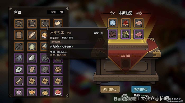 子時去夜磨坊,刷一個萬年玄冰就走。(這個是為了鍛造幹將,想做劍閣最終任務的還需要兩個萬年玄冰)這裡可以順便買加體力上限和內力上限的甲級藥材吃,賣的話這裡賣材料價值很高,砍的甲級木頭和多餘的甲級礦石可以賣了