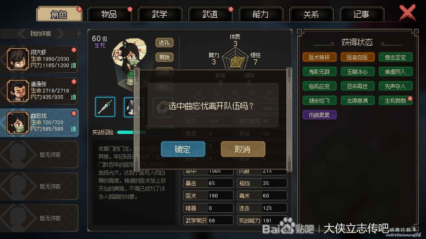 城裡逛一圈之後仁德到100了,可以去本草門找曲無憂了,她是強力奶媽兼職輸出,給得素女劍法掛流血很不錯,長得也很漂亮,打架姿勢用傘劍也很好看,及時拉入隊中。