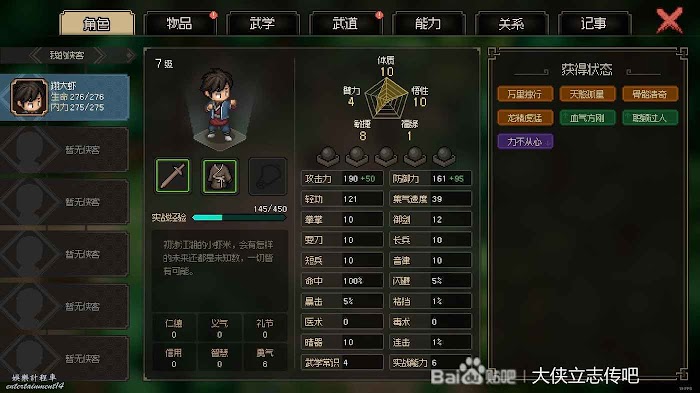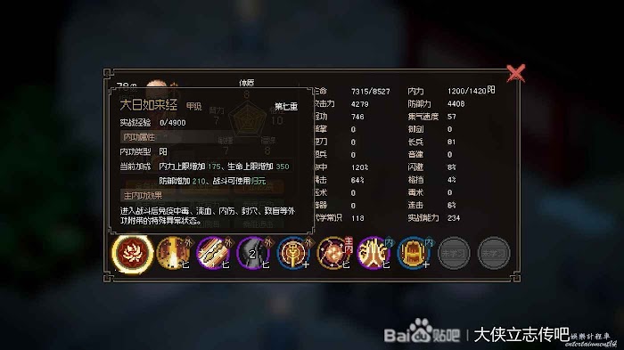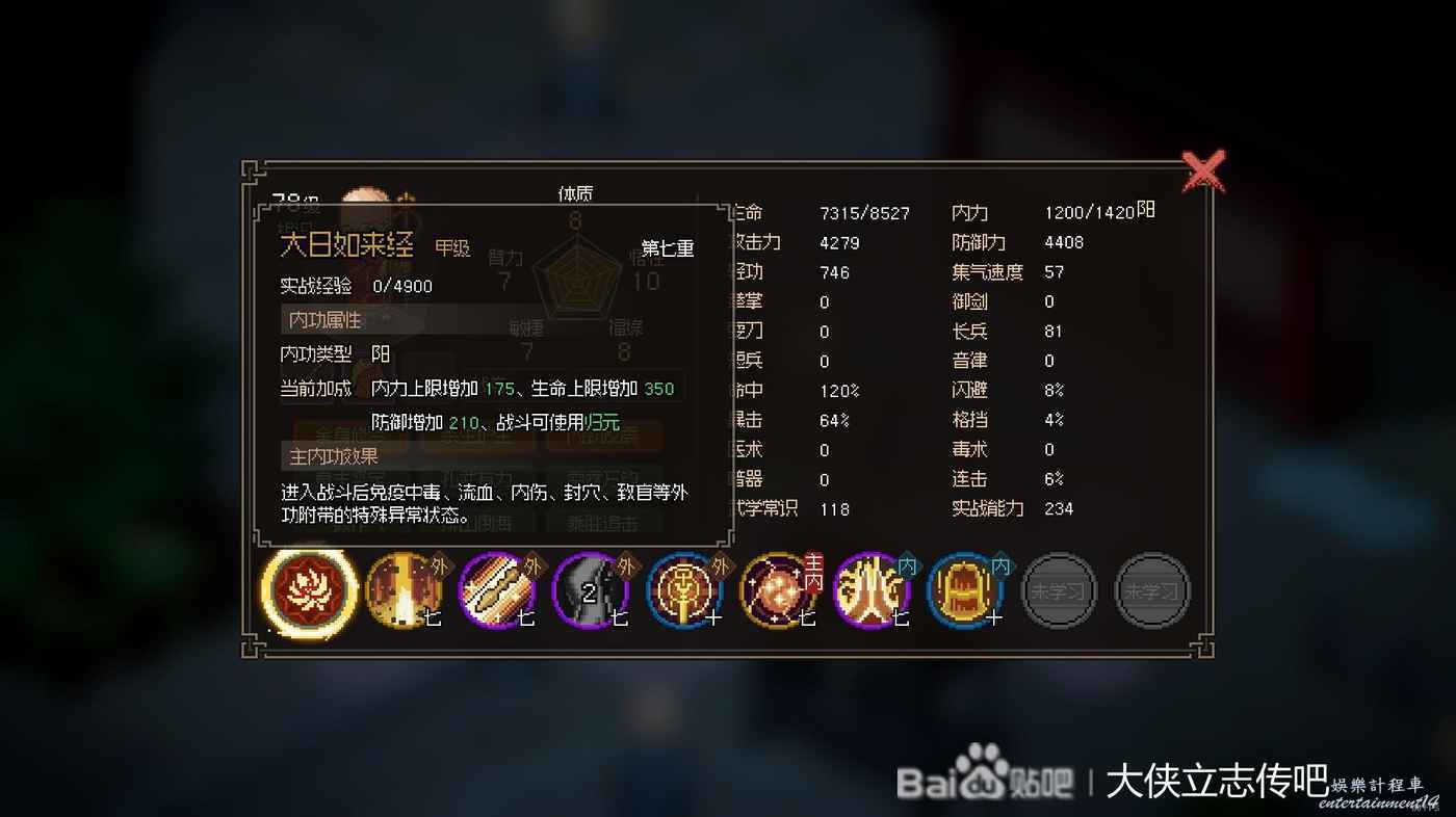 這是我目前的狀態和武學加點,這個狀態剿滅清風寨8成勝率吧,只要他不出三刀暴擊,磕藥是能過的,這個時候正常包裡至少兩瓶回300藥。