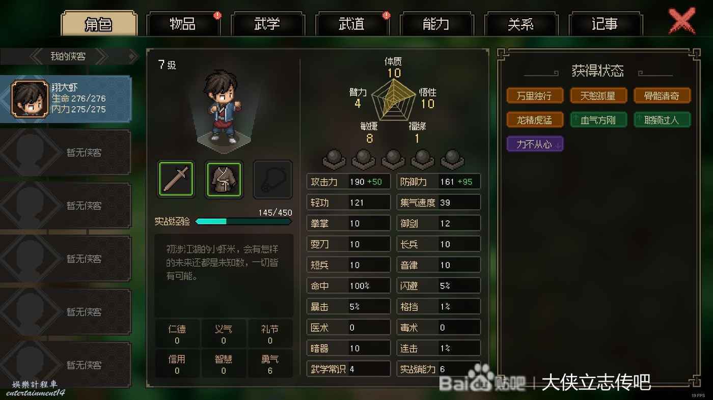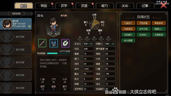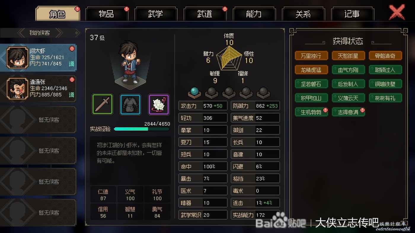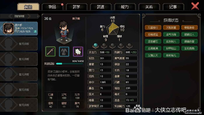 這是我目前面板,義氣禮節滿了,屬性這塊,之後拿到加屬性丹藥我就不吃了,儘量貼近一周目