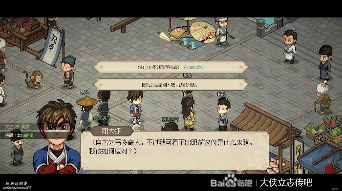 說一下霖安城的幾個事件。這個商人,給100文可能賺可能虧,給10000文穩定保本可能賺。可是他來錢太慢了,害的主動去找他,看他賺錢太累了。建議做法時給他100文加5智慧,然後不要管他了(如果之後再對話得知虧錢了會減10智慧,因此不要理他)