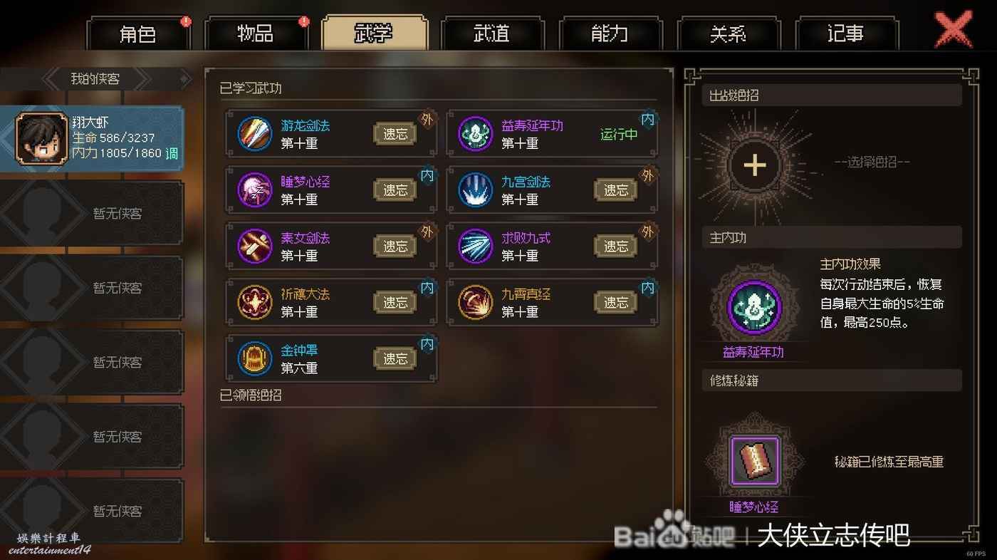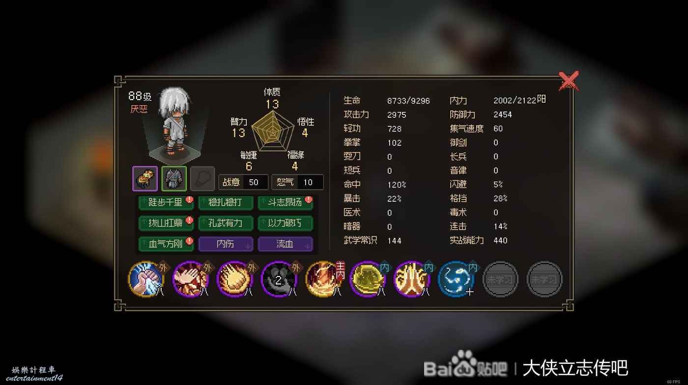 和大師兄苦戰到56級畢業了。目前這個面板可以82開(我8)五成功力掌門,55開七成功力掌門(最後和掌門同歸於盡算我贏)