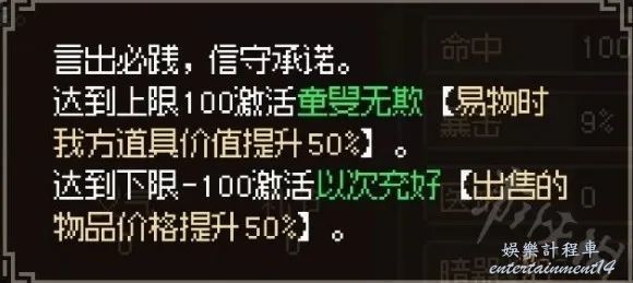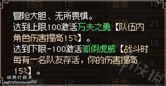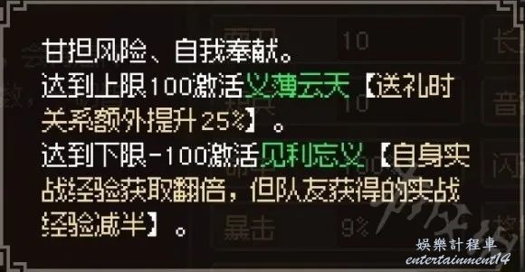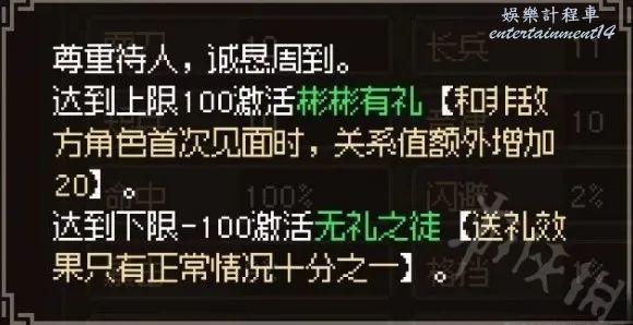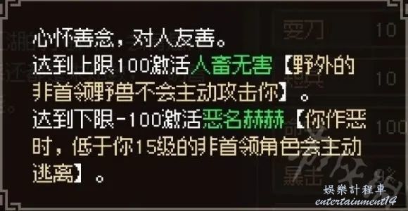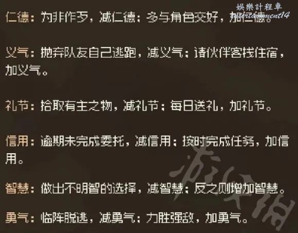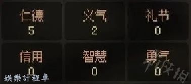 大俠立志傳 (Hero’s Adventure) 品格屬性效果一覽 15 3 月 2023-03-15 廣告 來源:互聯網 在人物介面可以看到角色的品格,品格會影響到npc的態度。 品格也會影響武功效果、加入門派、請教武功等。 注意查看前文不少武藝的條件,品格不滿足是不能學習的。 以下是各項品格的增減條件: 以下是各項品格的效果: 仁德 義氣 禮節 信用 智慧 勇氣