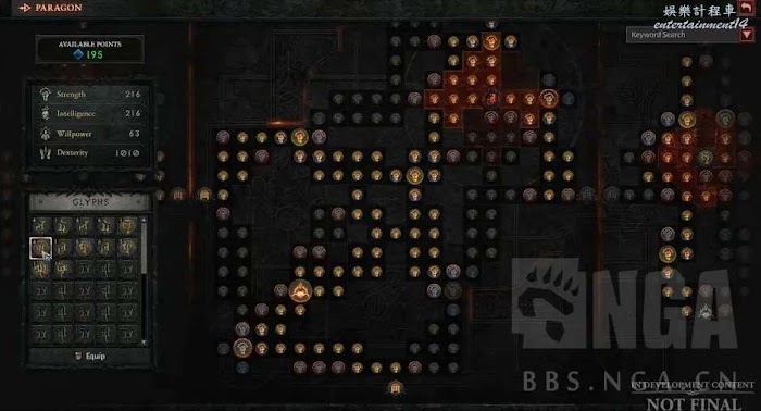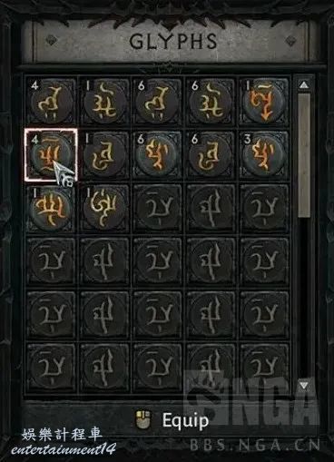 最左側的glyphs(字形或者符文)是通過刷圖獲得的,可以鑲嵌在巔峰天賦盤中生效。包含各種屬性效果。