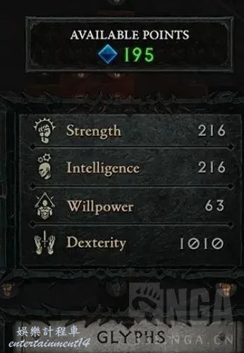 glyphs區域上方是角色當前的總屬性和巔峰天賦點數
