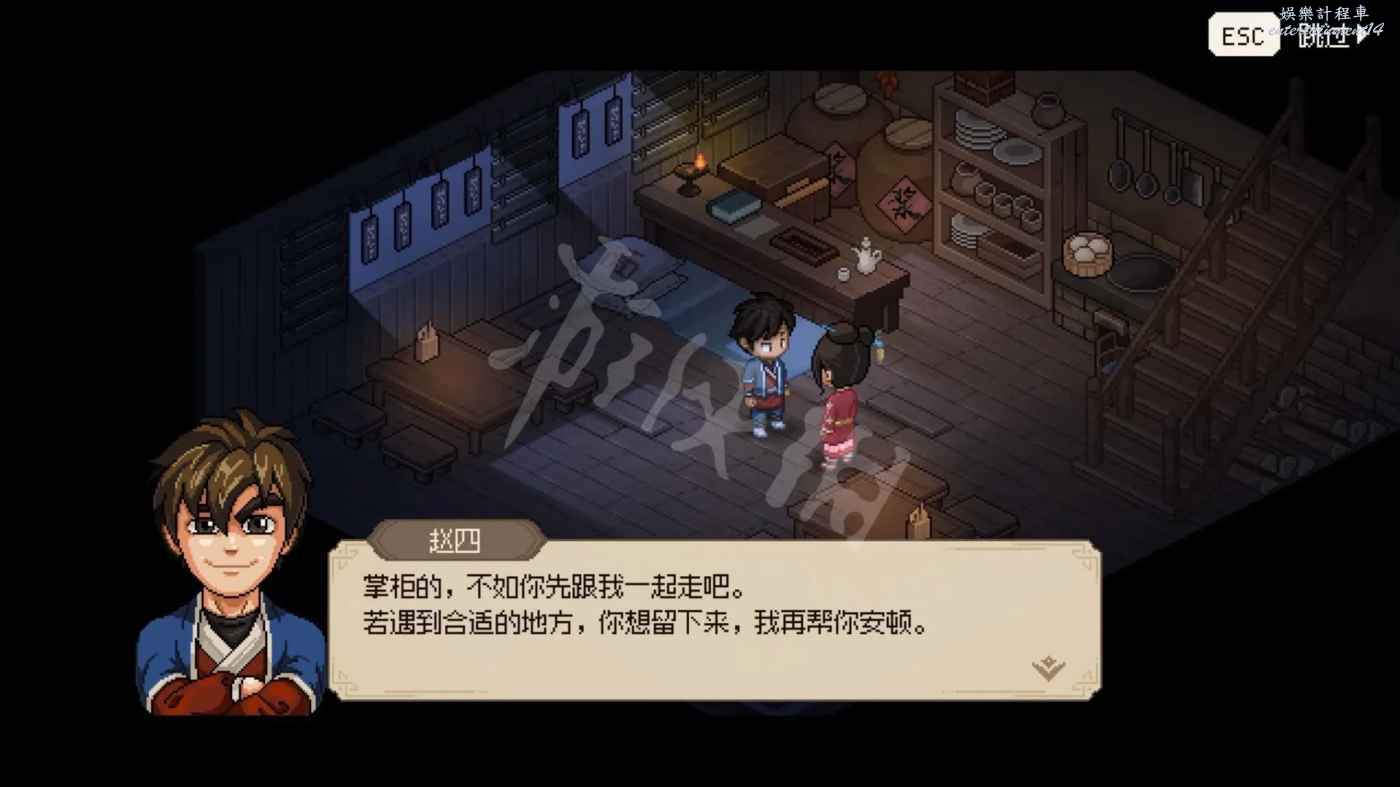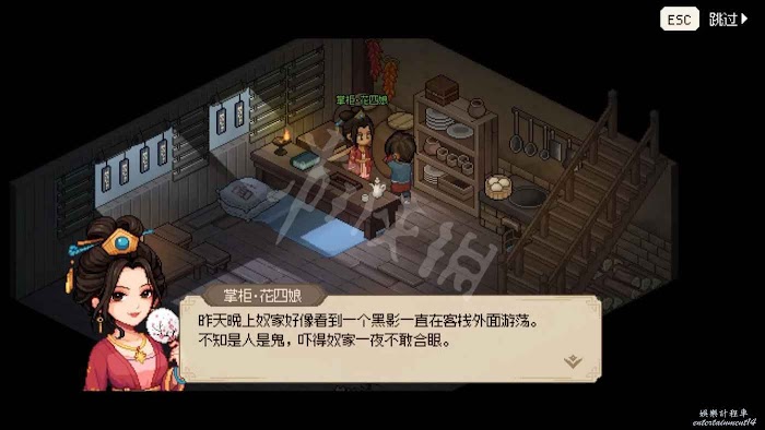 與花四娘對話,她會告訴主角在客棧外最近會有黑影出現,主角決定幫四娘調查清楚。