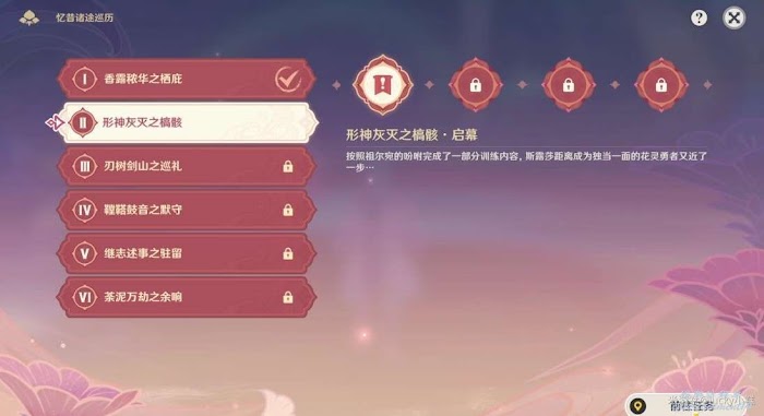 「憶昔諸途巡曆」活動前六天,每天會解鎖相應的任務和兩項試煉,新解鎖的內容需要完成前一天的任務與試煉後才能接取。
